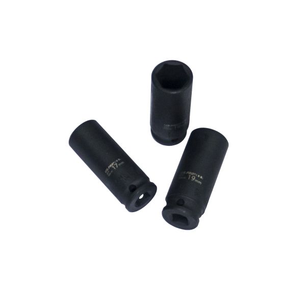 A set of 3/8″ drive, metric, 6 point, European style, deep impact sockets.